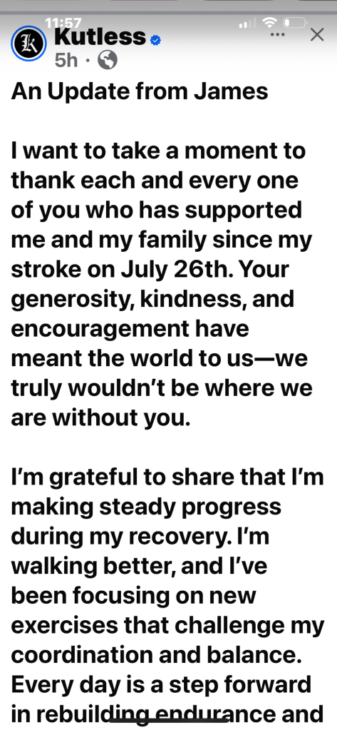 “I’m grateful to share that I’m making steady progress during my recovery. I’m walking better, and I’ve been focusing on new exercises that challenge my coordination and balance. Every day is a step forward in rebuilding endurance and promoting neuroplasticity, and my doctors and physical therapists are very encouraged by how far I’ve come.
