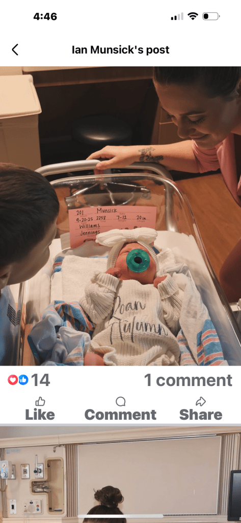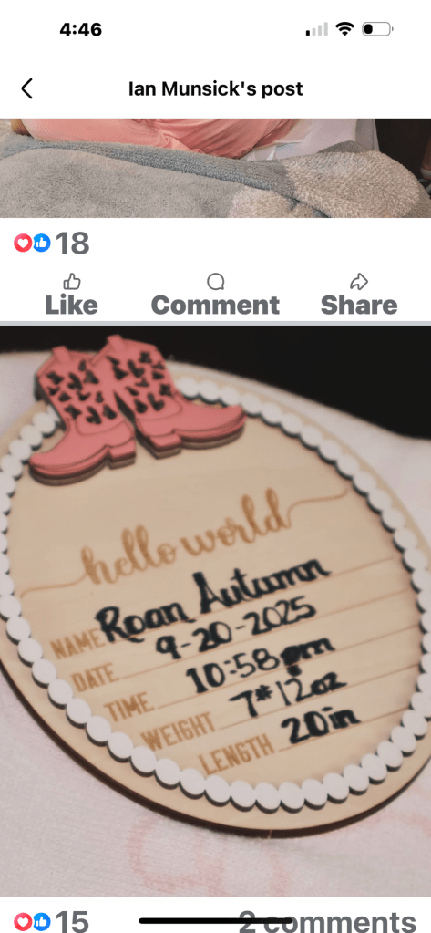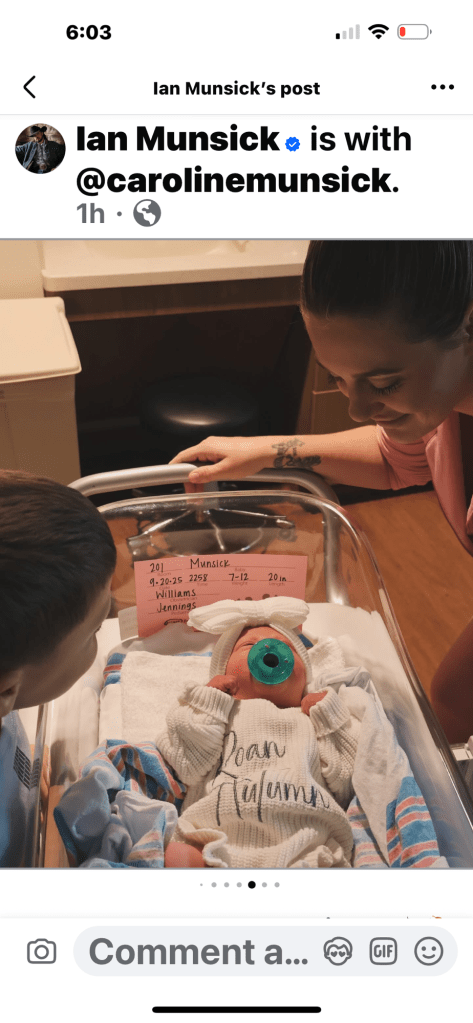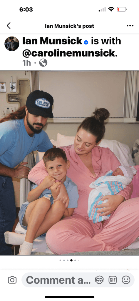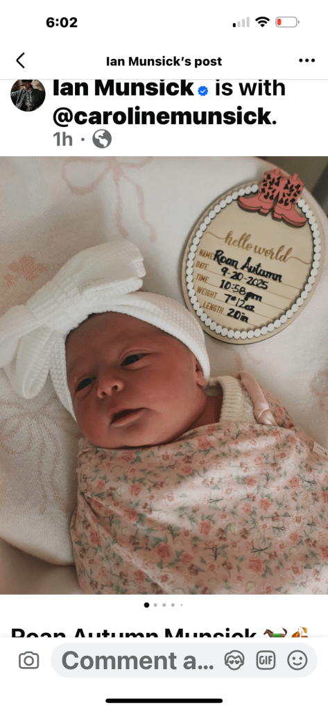 Congrats to Wyoming country singer Ian Munsick and his wife Caroline as they announced minutes ago that their newborn daughter Roan Autumn Munsick was born on September 20th at 10:58 p.m. weighing 7 pounds 12 ounces and she was 20 inches long.